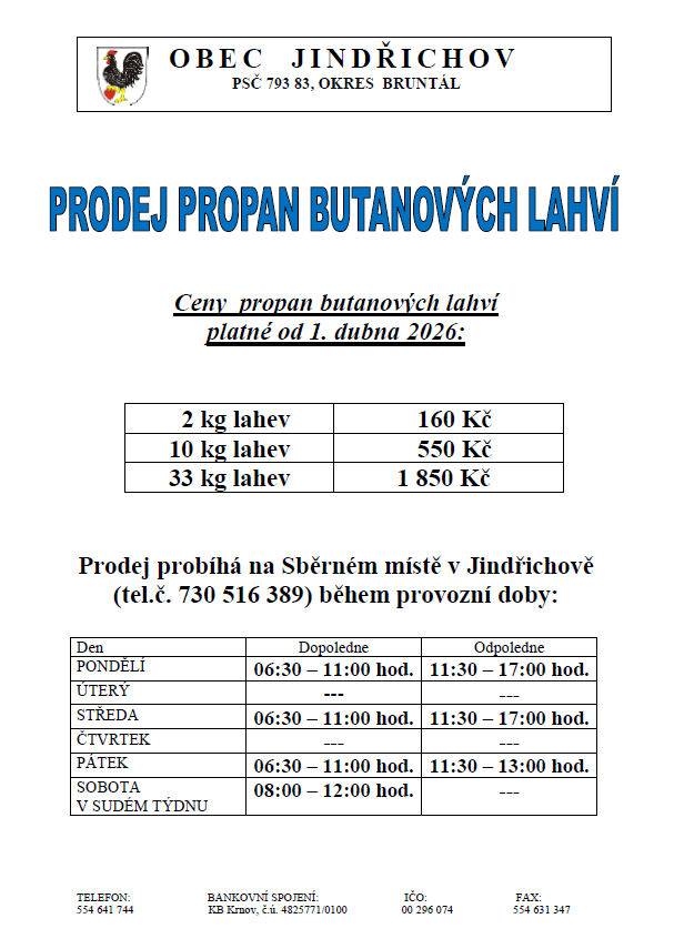 Od 1. dubna 2026 dochází ke změně ceny propan butanových lahví na Sběrném místě v Jindřichově: