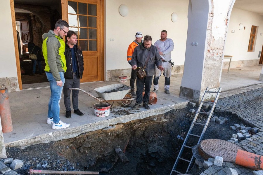 Výkopové práce odhalily původní kameninové potrubí. Nová dešťová kanalizace bude napojena na stávající vedení v části nádvoří s betonovou dlažbou, zatímco další úsek už povede novým plastovým potrubím. Kanalizace je upravována tak, aby bylo možné v další etapě jednoduše napojit nové sociální zařízení.