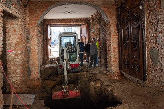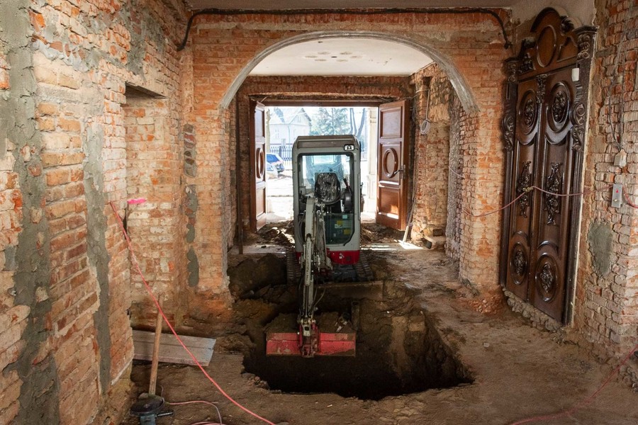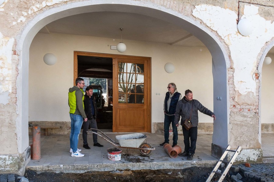 V průjezdu je dokončené oklepání omítek a po odstranění původní pojízdné plochy začaly výkopové práce související s pokračováním rekonstrukce kanalizační sítě. Dva malí smykoví bobíci tu pracují v návaznosti – jeden hloubí, druhý odváží zeminu, aby nedocházelo ke zbytečným časovým prodlevám. Pokračují přípravy pro další instalaci vodovodního potrubí, které bude možné připojit ke zdroji vody hned, jak to počasí dovolí.