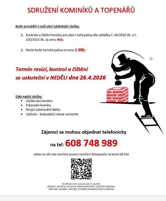 Sdružení kominíků a topenářů oznamuje občanům, že v neděli 26. dubna 2026 bude provádět v naší obci: