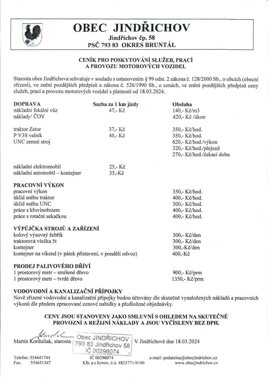 Informujeme občany, že Obec Jindřichov vydala s platností od 18. března 2024 nový ceník pro poskytování služeb, prací a provozu motorových vozidel.