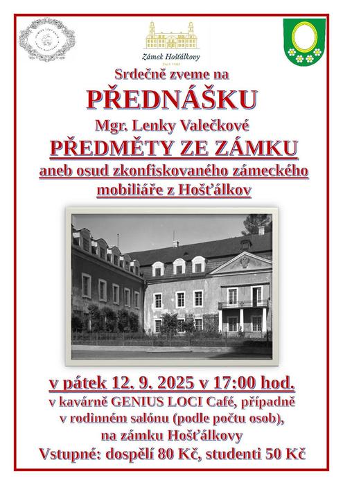 Zámek Hošťálkovy srdečně zve na zajímavou přednášku Mgr. Lenky Valečkové, kurátorky výtvarného umění Slezského zemského muzea v Opavě. Historie zámku v Hošťálkovech je poměrně známá, avšak vyprávění se obvykle uzavírá větou, že byl zámek roku 1945 rodině Arco zkonfiskován a o několik let později byla budova přidělena pro sociální služby. Co se ovšem dělo s předměty, které zůstaly opuštěné v prostorách zámku? Jaká byla praxe v nakládání se zkonfiskovanými zámeckými mobiliáři? Dochovalo se něco z arcovských předmětů? Přednáška seznámí posluchače s osudem hošťálkovského zámeckého mobiliáře, jeho tříděním, rozvozem napříč republikou, ale i se současným uložením vybraných předmětů, především rozsáhlé kolekce obrazů.