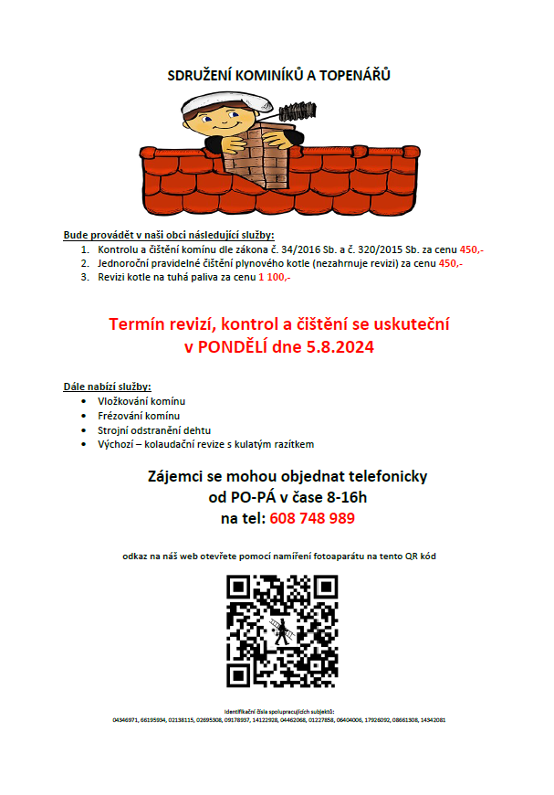 Sdružení kominíků a topenářů bude v Jindřichově v pondělí 5. srpna 2024 provádět následující služby: