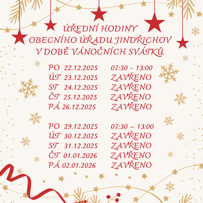 Úvod > Aktuálně > Úřední hodiny Obecního úřadu Jindřichov o vánocích 2025