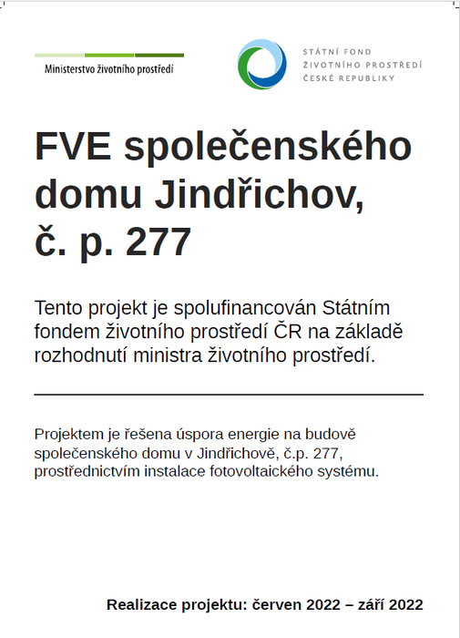 Z fotovoltaické elektrárny (FVE) je napájeno především nouzové osvětlení a také běžný provoz celého objektu. Celý projekt ve výši 1 205 000,- Kč včetně DPH byl financován ze Státního fondu životního prostředí z programu na podporu nevyhovujících kotlů na pevná paliva a z vlastních prostředků obce. Podíl obce činí cca 120 000,- Kč. Instalace FVE byla provedena v červnu 2022.
